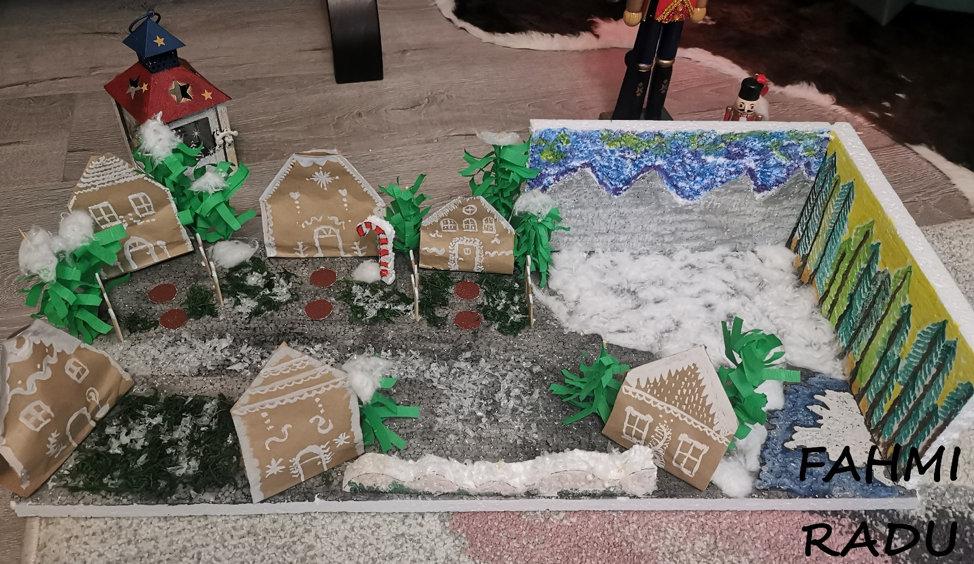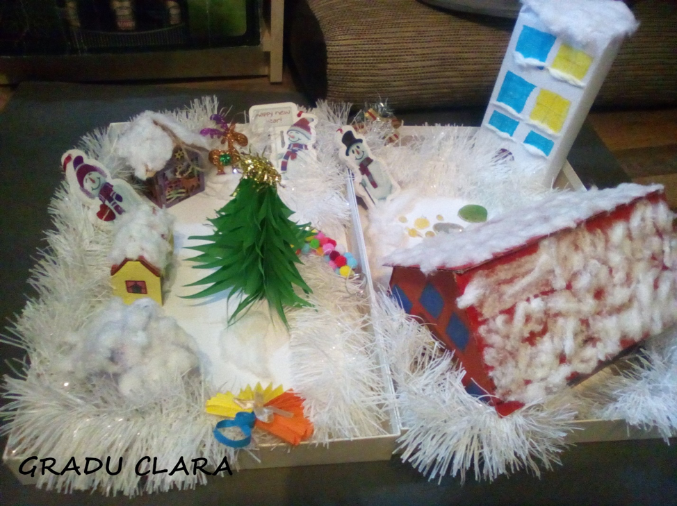 Proiectul a fost împărțit în mai multe etape. Elevii au realizat în prima săptămână casele, iar în a doua săptămână brăduții și zăpada așternută peste sat. A fost nevoie de multa creativitate din partea lor.
